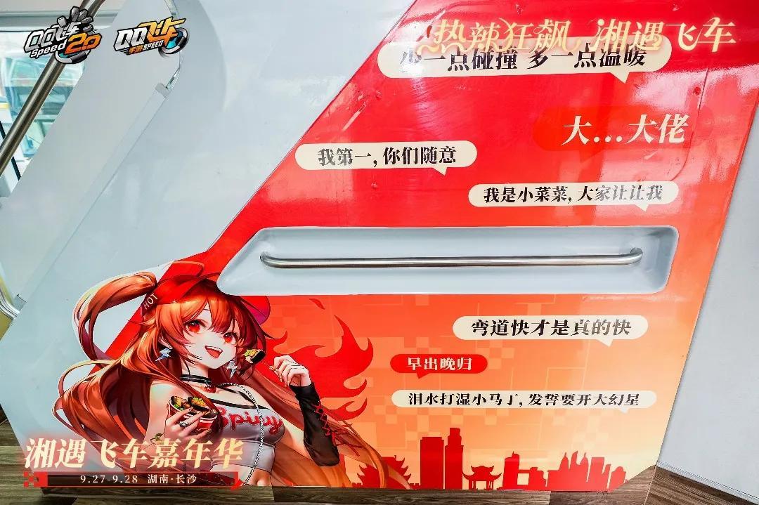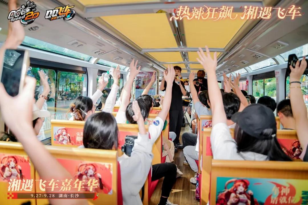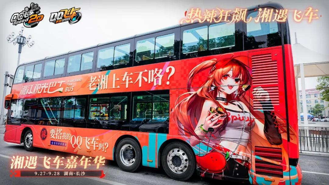 前兩天在長沙開啓的「湘遇飛車嘉年華」,還有城市公交線路的聯動,準備了“小橘子巴士”供玩家們遊覽湘江。車外的標語直接用湖南口音“整活”——“老湘上車不咯”,車屁股還貼着“兄弟別超我車”;上車以後,二層樓梯按照遊戲的段位來設計,車廂裏每個角落都藏着飛車的遊戲梗和彩蛋。