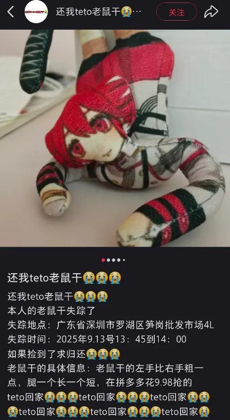 因而你會看到,儘管是很便宜的製品,一旦老鼠幹丟失,還是有不少人在社交平臺發佈類似“孩子回家”的尋物啓事。這種丟失後的失落,並不是輕易能用金錢去衡量的,原先那隻陪伴了更長時間,承載了更多情感,新的老鼠幹怎麼也不如“失而復得”來得快樂,怎麼也不能和原來的相提並論。