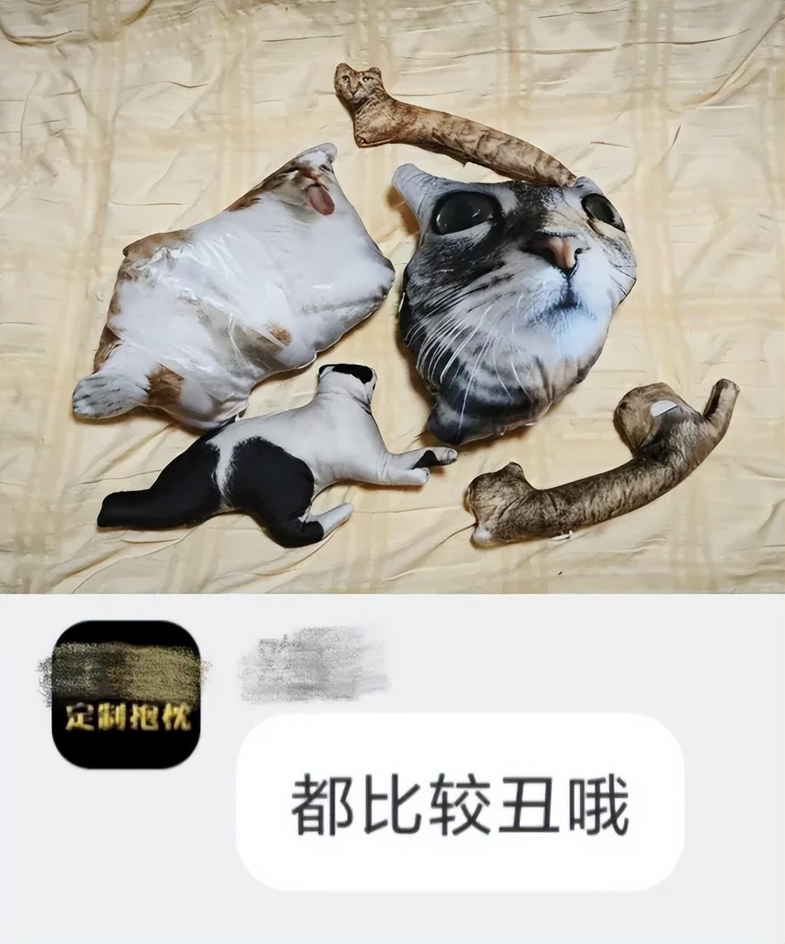 於是, “醜貓抱枕”誕生了。一系列各種姿態的小貓圖片被拿去,定製出醜得千奇百怪的變體。
