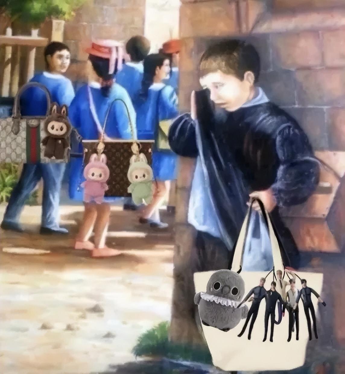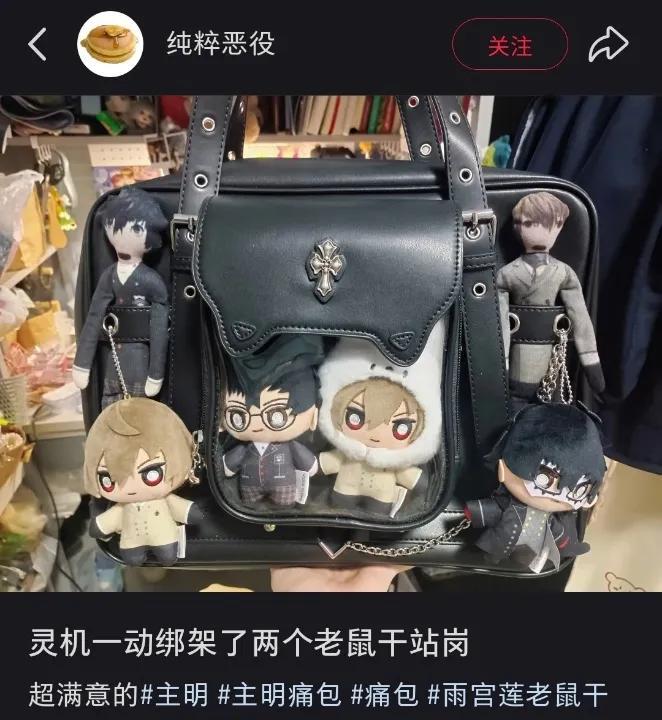 現在,如果去觀察大街上揹着“痛包”的人羣,你有時候會發現,“痛包”裏一隻正經的棉花娃娃旁,歪七扭八倒着一隻老鼠幹。同樣都是毛絨玩具,同樣是情緒價值,醜陋的老鼠幹所承載的情感,未必不如那些昂貴且精緻的娃娃。