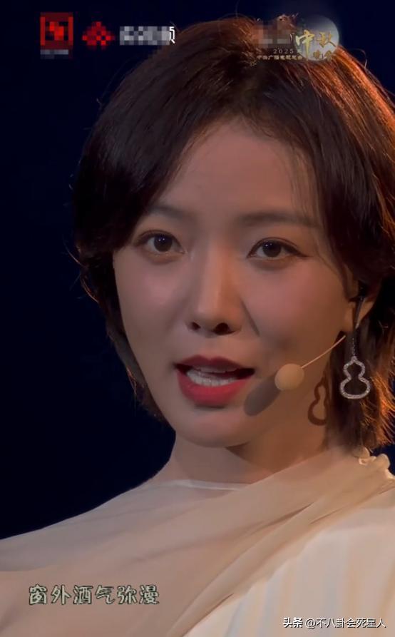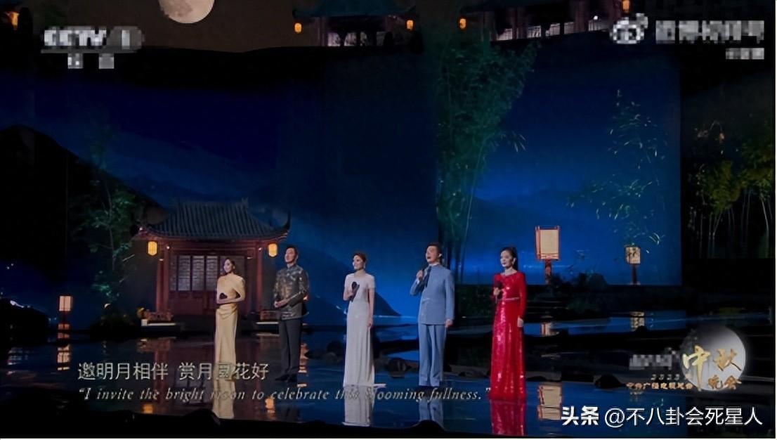 幾個角度的鏡頭掃過,都顯得周筆暢疲憊、老氣,沒什麼精氣神。另外,她的禮服也不符合中秋的氛圍,藍色配白色,色調過冷,款式也太老了。