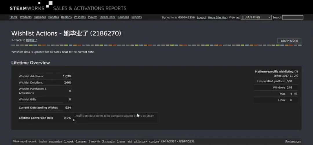 讓這件事更顯荒誕的是,今年6月,《她畢業了》參加了Steam新品節,願望單數量從五百左右一度突破一千,儘管最後有所回落,但也維持在接近千份的水平。