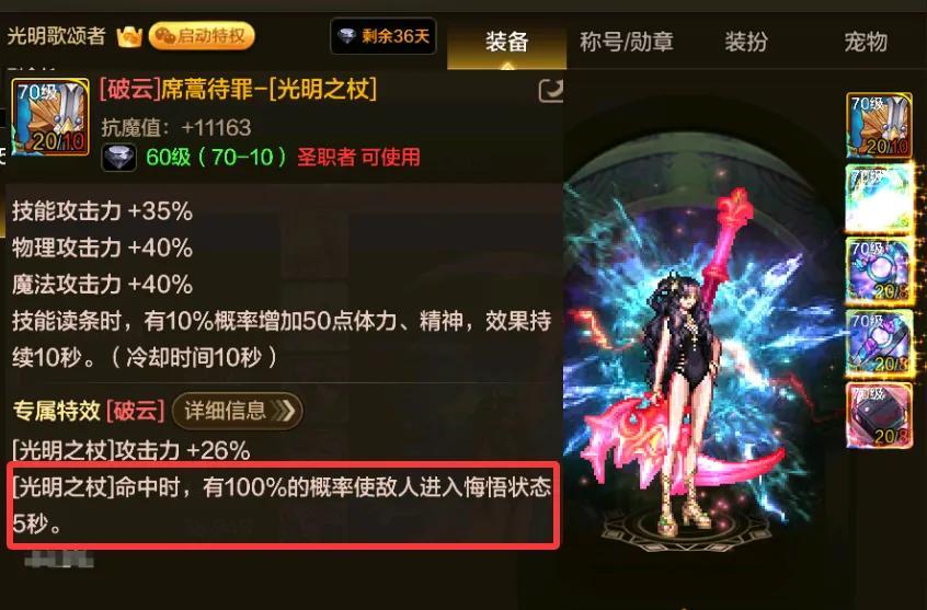 核心原理:當奶媽佩戴“破雲武器”後,釋放光明之杖技能,可以讓敵人100%進入懺悔狀態5秒!