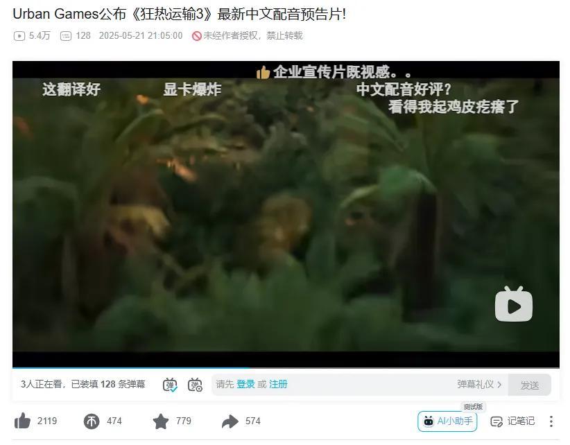 5月份的時候,《狂熱運輸3》在 B 站官號發佈了首支預告片,還是中文配音的,得到了積極的反饋。