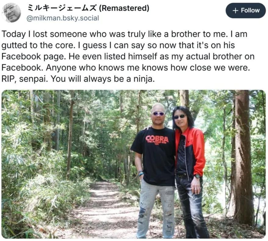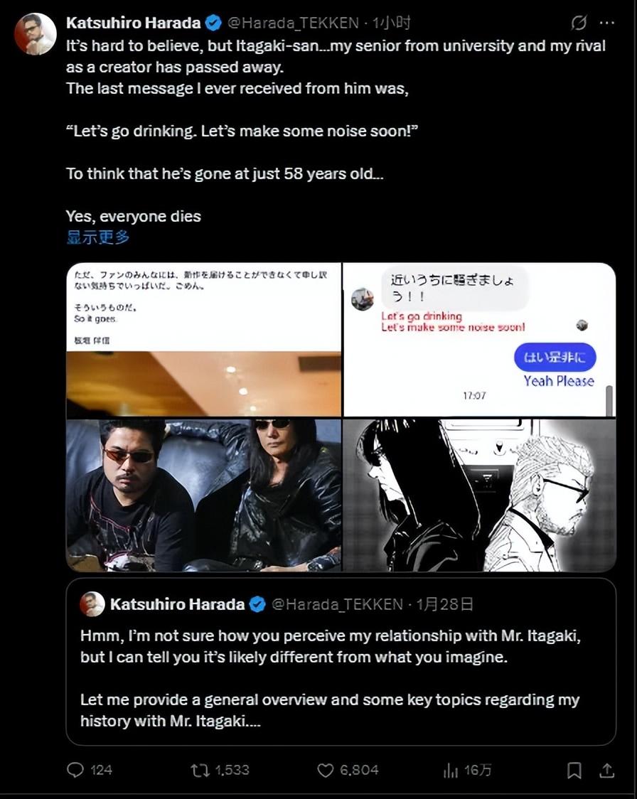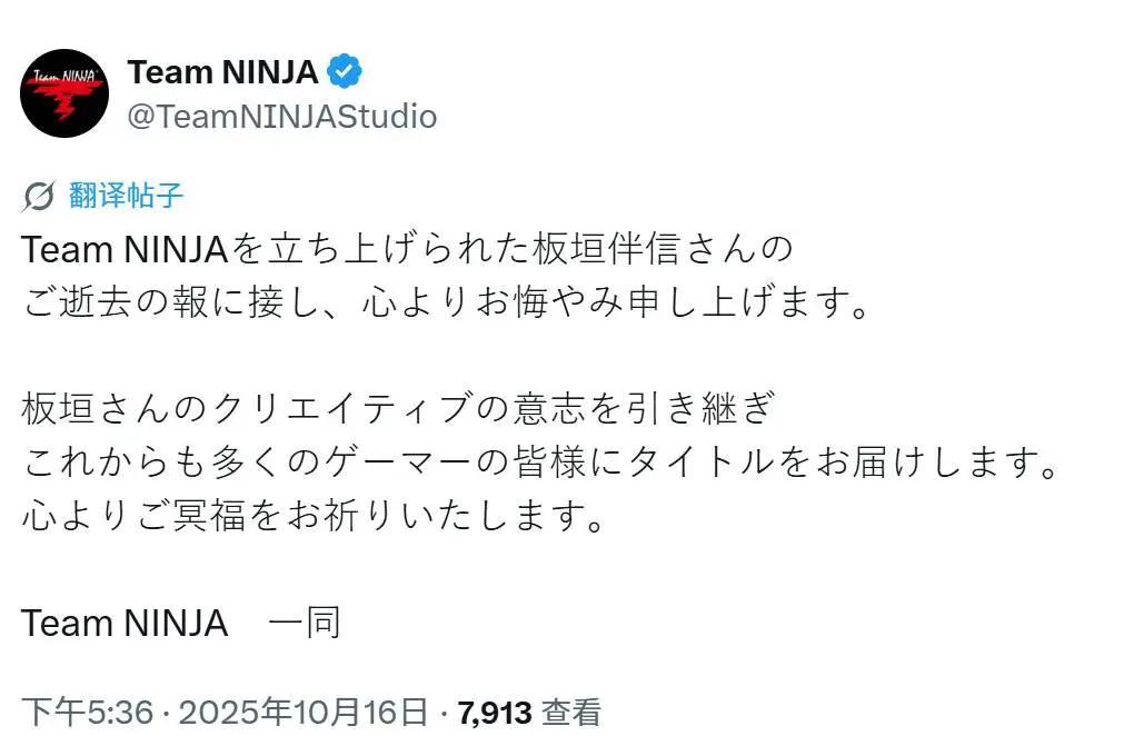 隨後,忍者組TEAM NINJA官方X賬號也發佈公告,對板垣伴信的逝世表達了深切哀悼。板垣伴信多位好友也在各社交媒體平臺上發佈悼念,使得這條死訊得到多方證實:板垣先生確以一種特殊的姿態宣告離開了這個世界,享年58歲。
