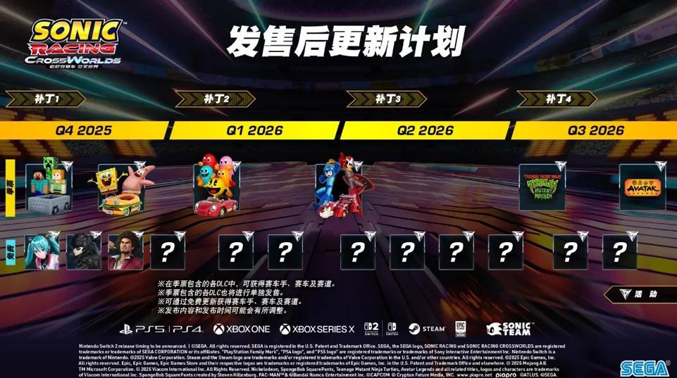 其實在前作《索尼克全明星賽車》系列中,我們就做過類似的嘗試,當時玩家們的反響非常好。所以這次在《交叉世界》裏,我們也延續了這一方向。這次我們計劃在遊戲發售後,每個月進行一次內容更新,包括新增一些免費角色。