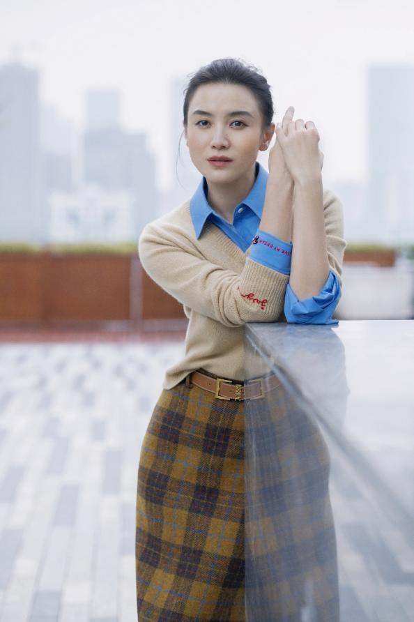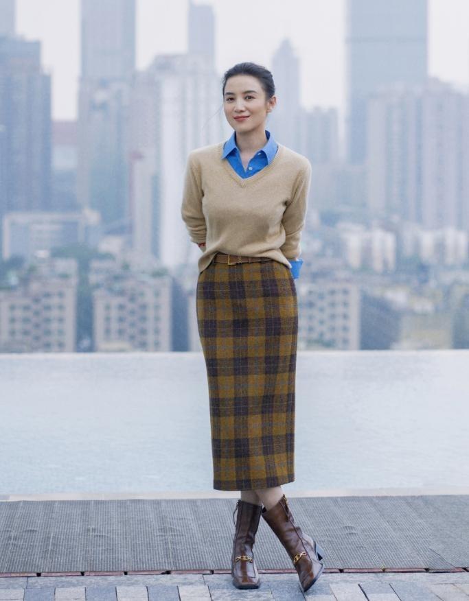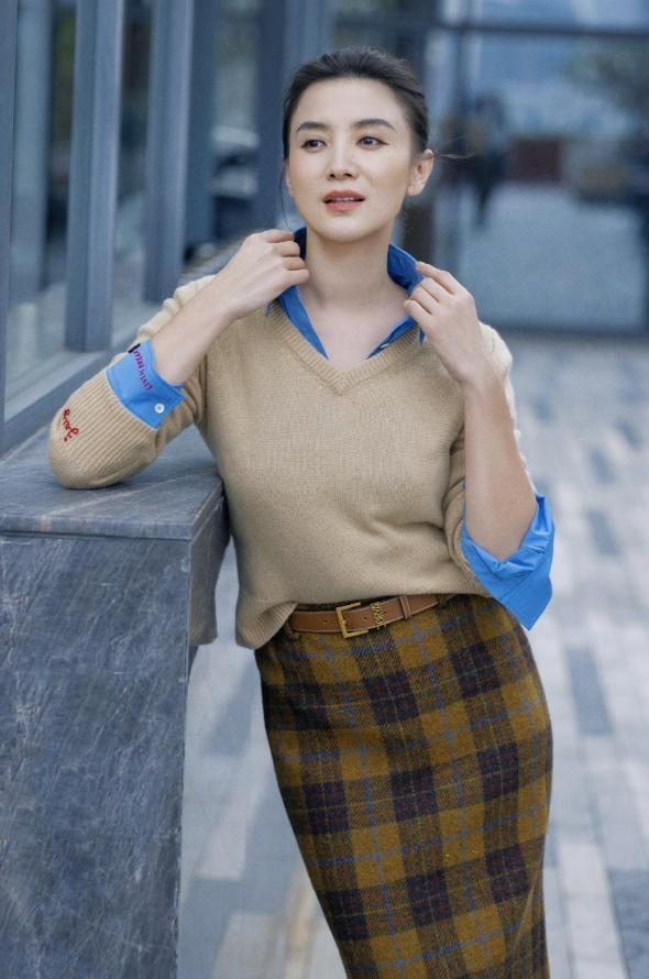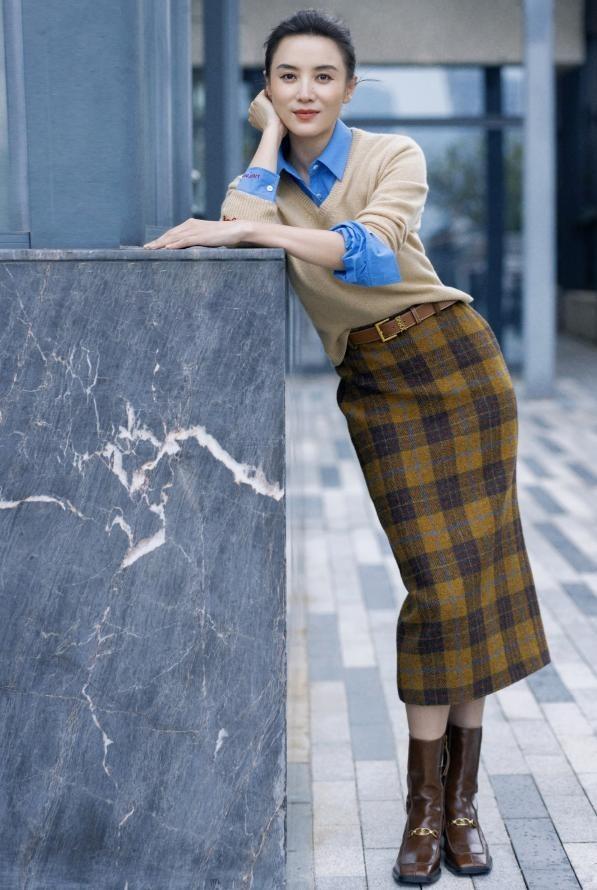 宋佳作爲妥妥的“氣質女神”,在穿搭上從不會太過浮誇,大多數都是比較基礎的單品,所以玩轉疊穿就很輕鬆自然。基礎款式的藍色襯衫,疊搭卡其色V領羊絨衫,露出衣領、袖口就很有層次感,下身搭配格紋元素的半身裙,平添一絲復古氣息。