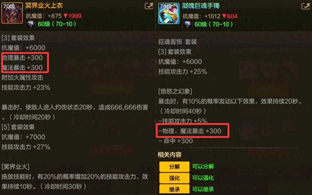 “業火套”自帶300點暴擊,“巨魂套”也自帶300點暴擊。