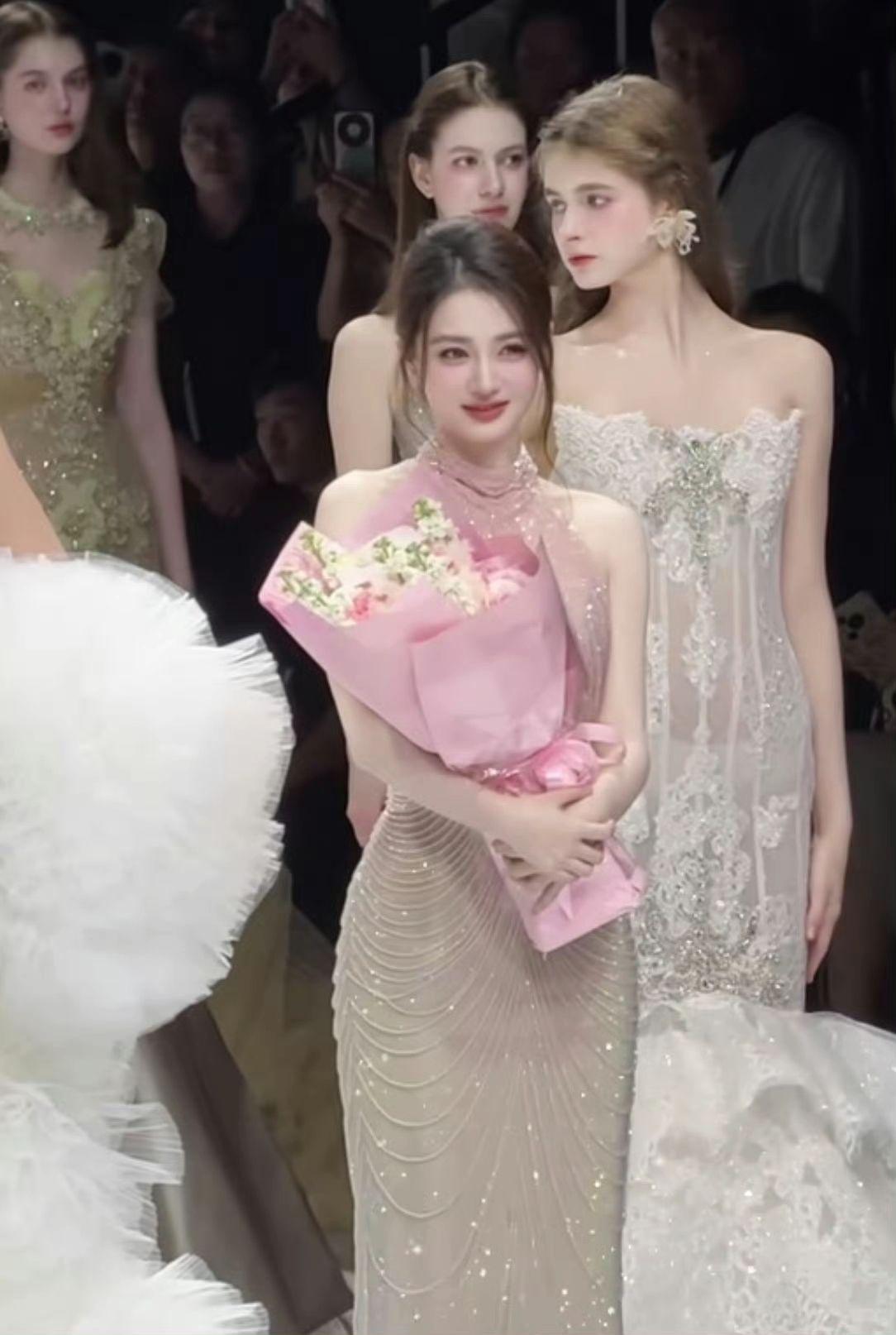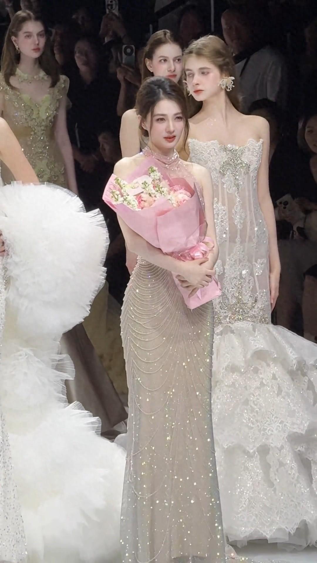 驚豔亮相的徐璐,真是美出了新高度。在一羣模特當中,甚至完全沒有被碾壓,站在c位的她,穿着一件亮片元素的包臀魚尾禮服裙,掛脖款式秀出直角肩,簡直美到犯規!