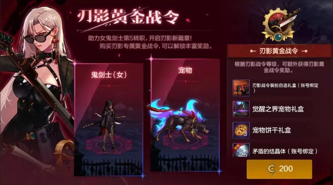 一個是“刃影戰令”,售價200點券,只有刃影可入手,通過升級可解鎖時裝、矛盾結晶體、界寵物、寵物餅乾等道具。
