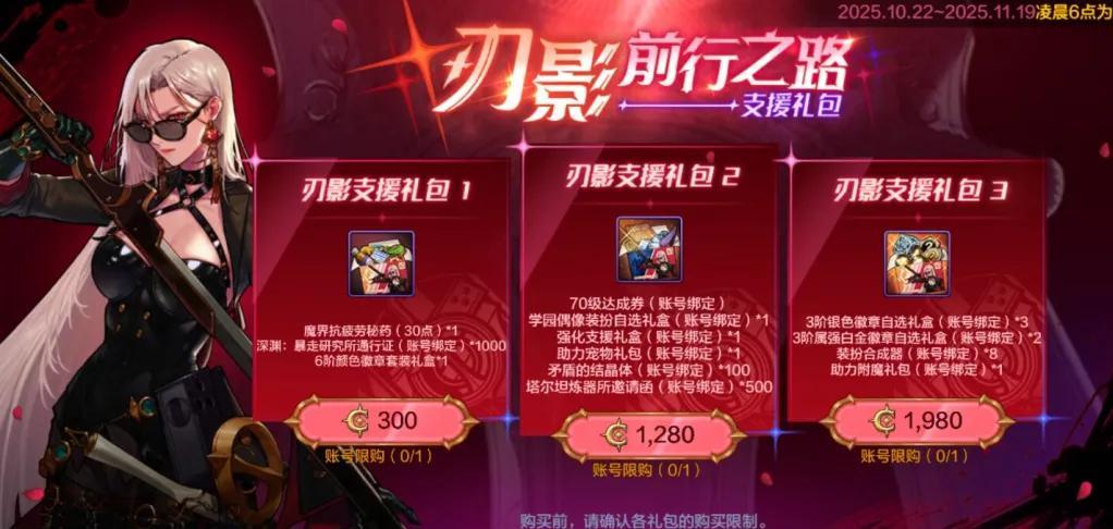 另一個是“支援禮包”,有3種款式可供選擇,主要是用於加速刃影畢業打造的道具,具體內容如下: