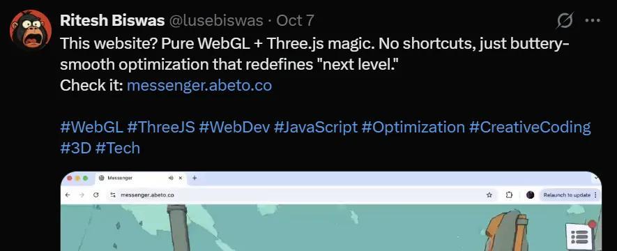 “純粹的 WebGL + Three.js 魔法。沒有捷徑,只有絲般順滑的優化。”