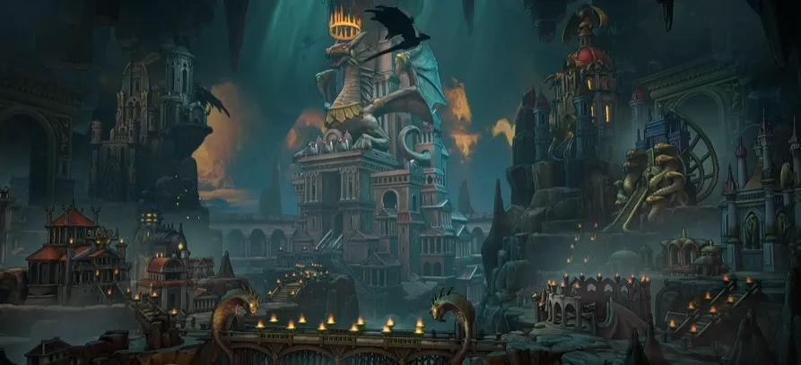 圖爲“上古紀元”中的“地牢”主城,作爲以頂級單位“黑龍”聞名的陣營,主城也重點體現了龍這一要素