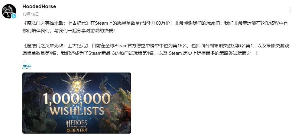 不久前,發行商HoodedHorse公開了一個好消息:《魔法門之英雄無敵:上古紀元》的測試版獲得了在Steam上的願望單數量已超過100萬份,也是本次Steam新品節的試玩第一名。