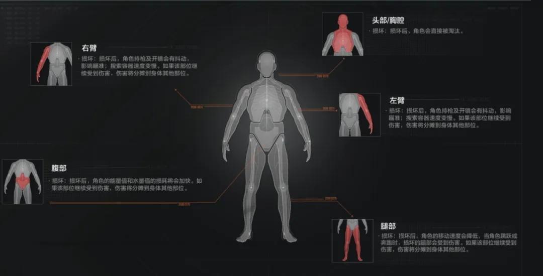 遊戲的健康系統,同樣師承塔科夫的多部位損傷與藥品管理設計:角色的每個身體部位都有獨立的血量和功能,不同的異常狀態足足有十幾條,受傷後不僅要止血、修復,還要應對視野模糊、體力下降等連鎖反應。