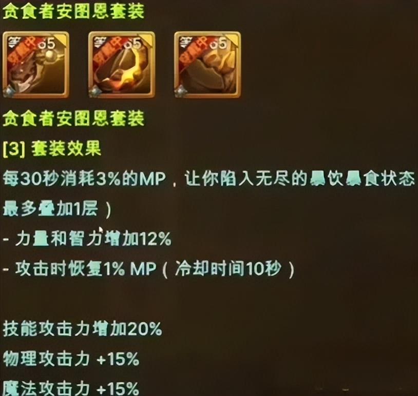 “貪食系列”又分爲輸出和輔助套裝,輸出套增加技攻和雙攻力智,輔助套減少周圍敵人傷害和防禦。