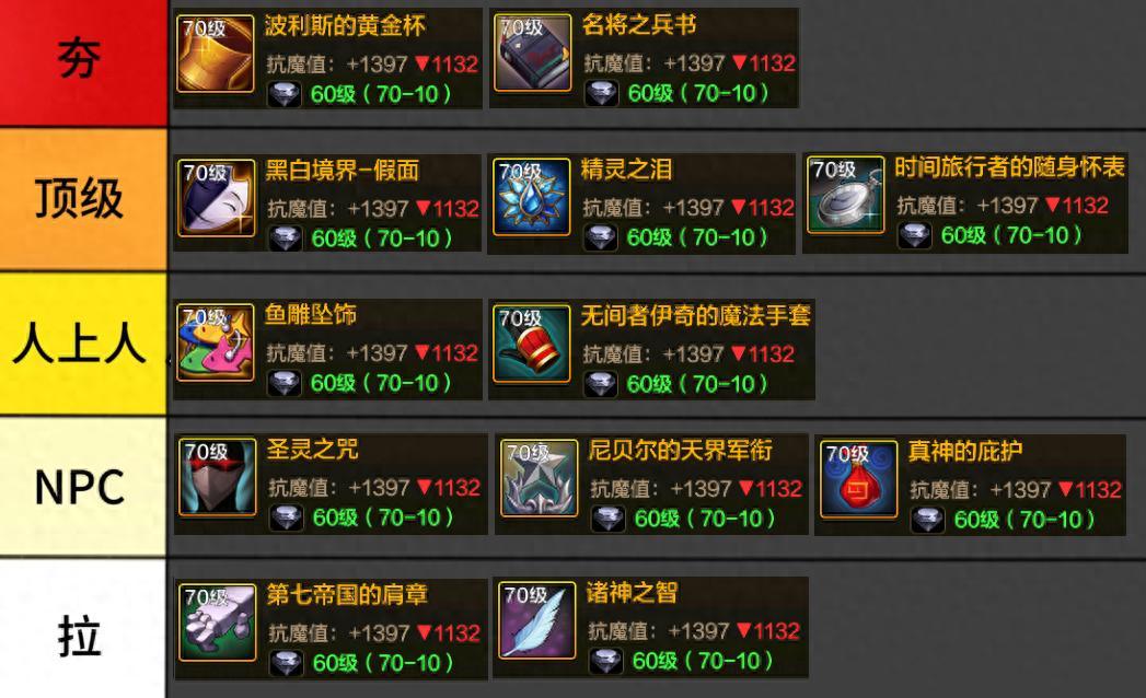 總的來說呢,“T0級”黃金盃和名將兵書,以及“T1級”黑白假面、精靈之淚、以及懷錶,在某些特定環境中都可以作爲畢業搭配選擇!