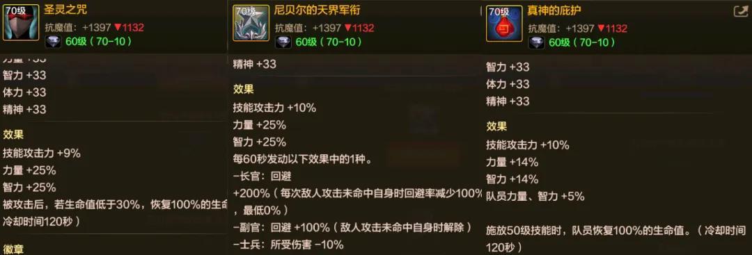 “聖靈之咒”自帶高防禦和2分鐘一次回血;“天界軍銜”自帶高額迴避;“真神的庇護”可以爲隊友回血。
