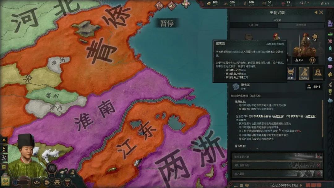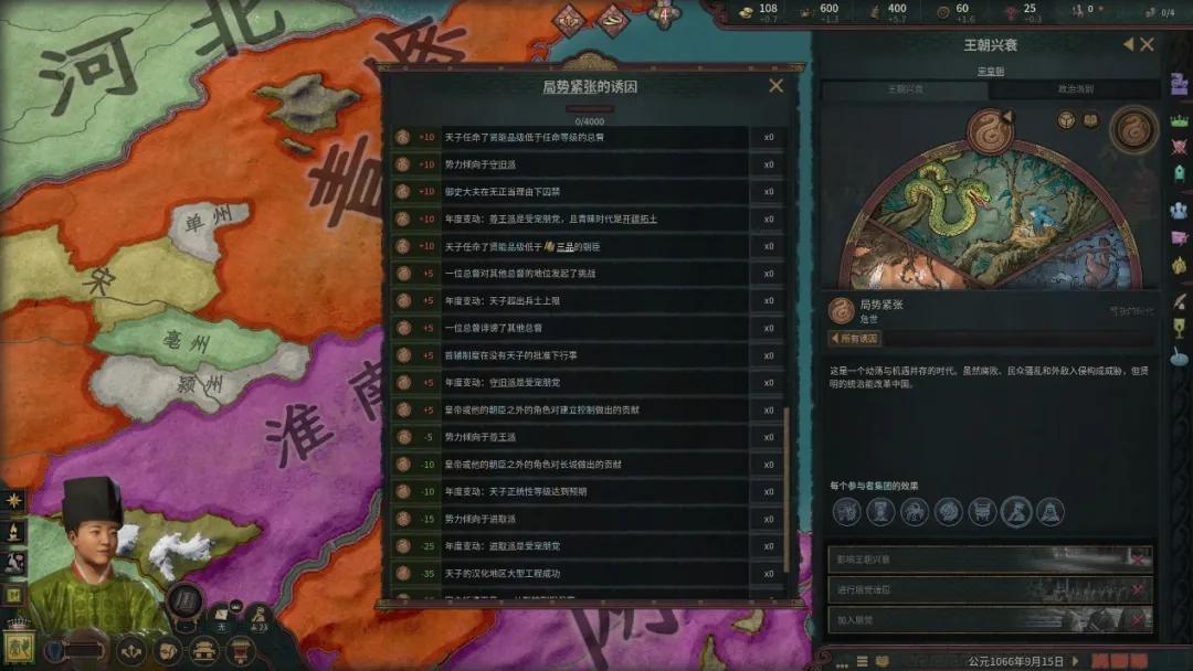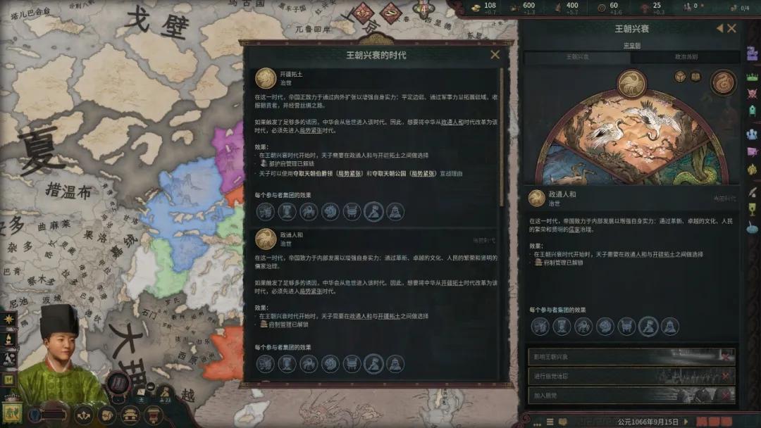 例如在“政通人和”的局勢下,皇帝無法親自發動對外戰爭,只能通過大型工程中的“開邊”決議來給手下的封臣制定戰略目標。這也就意味着玩家在這個階段需要將主要的精力放在國家的內政上,在這個局勢下玩家擁有許多內政治理相關的BUFF,用來模擬“治世”,對於喜愛種田的玩家來說可以好好過一把建設癮。