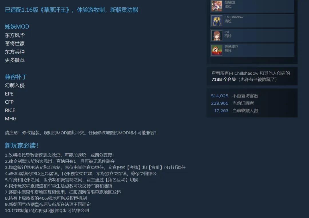 得益於強大的玩家社區,這個願望早就已經可以通過社區長出來的MOD實現了,「東方王朝」至今仍是創意工坊中訂閱排名前十的CK3 MOD,擁有接近23萬的訂閱玩家。