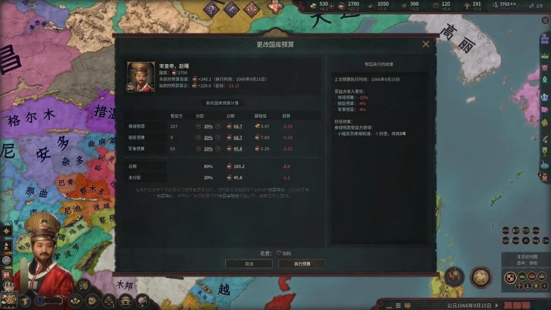 所以「溥天之下」通過“國庫”這個系統將領地的財政收入與領主的個人收入區分開來,土地財政收入的一部分上繳中央,一部分留在地方府庫中,領主的個人財富來自莊園的產出與朝廷的俸祿。所有的官方行動使用的都是國庫中的貨幣,皇帝每年都需要制訂國庫的預算分配比例,這往往也代表着朝廷的施政方向。