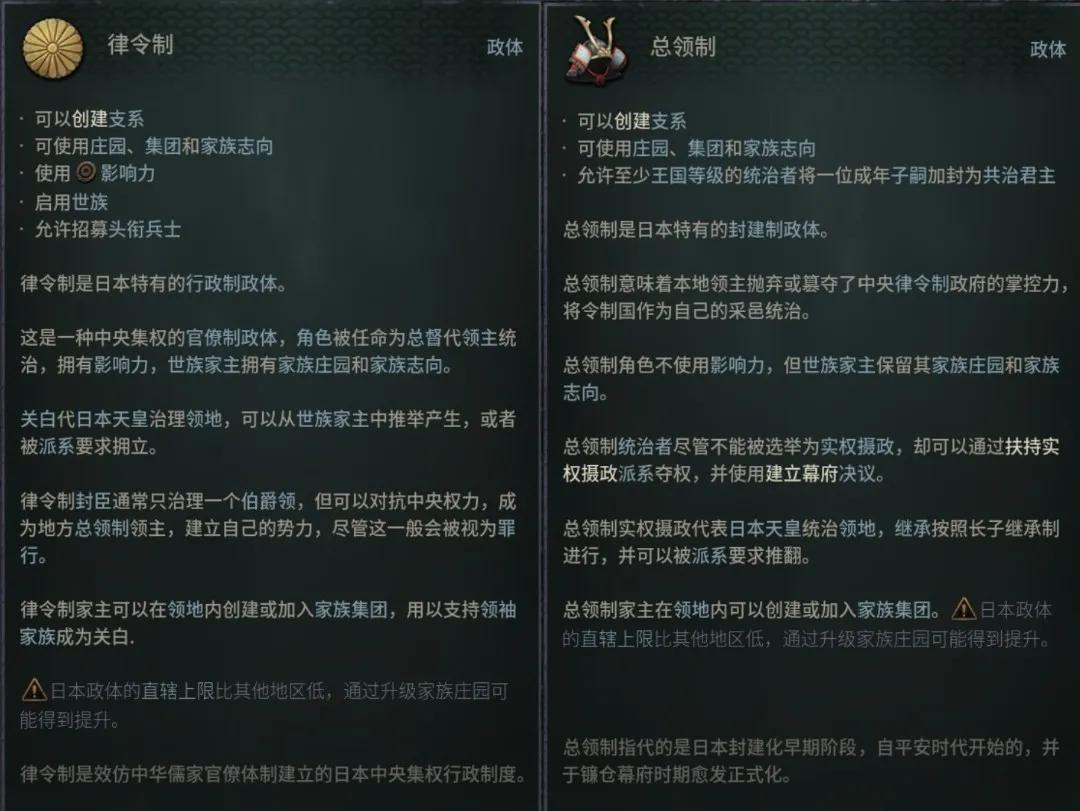 而日本則非常奢侈的擁有“律令制”和“總領制”兩種政體,用來模擬平安京朝廷與地方豪族武士的差異,並且在這一時代天皇已經被關白代表的權臣家族架空,所以收回權力的天皇、統一日本的關白、建立幕府的武士都是值得一試的選擇。