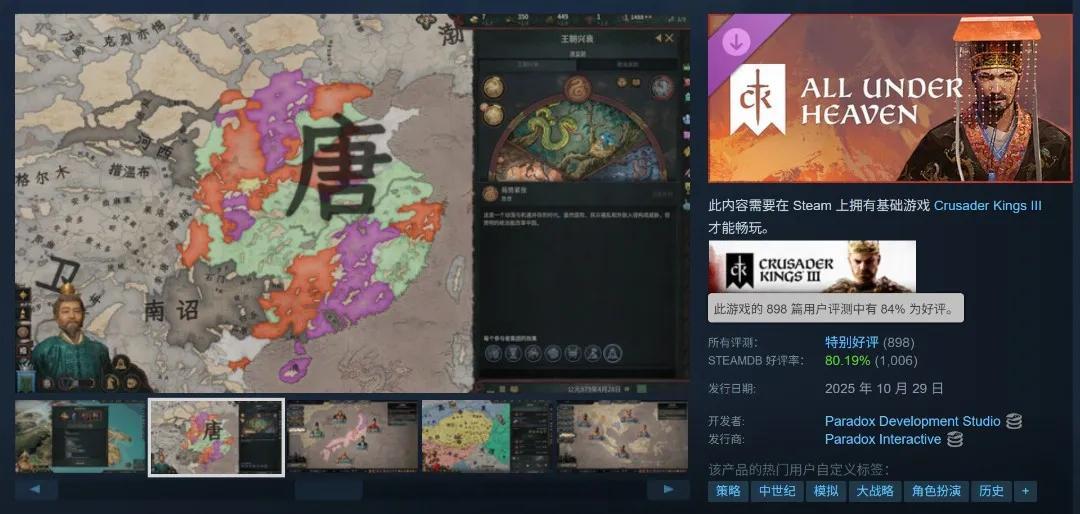 好在,P社鋪墊了已久的東方題材DLC「溥天之下」終於來了。10月29日凌晨1點正式解鎖發售後僅僅一天,這個DLC已經有了超過一千條評價,目前也躋身CK3歷史好評率最高的DLC之一。