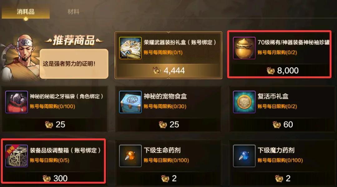這裏每個月也可以換2個裝備罐子,雖然只能開出稀有~神器,不過拿給小號還是挺不錯的。