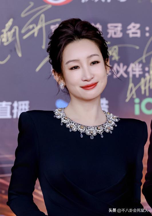 一套黑色禮服配白色珍珠領口,加上大紅的脣色,讓秦海璐看上去格外大氣端莊。