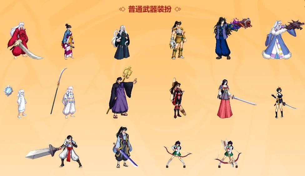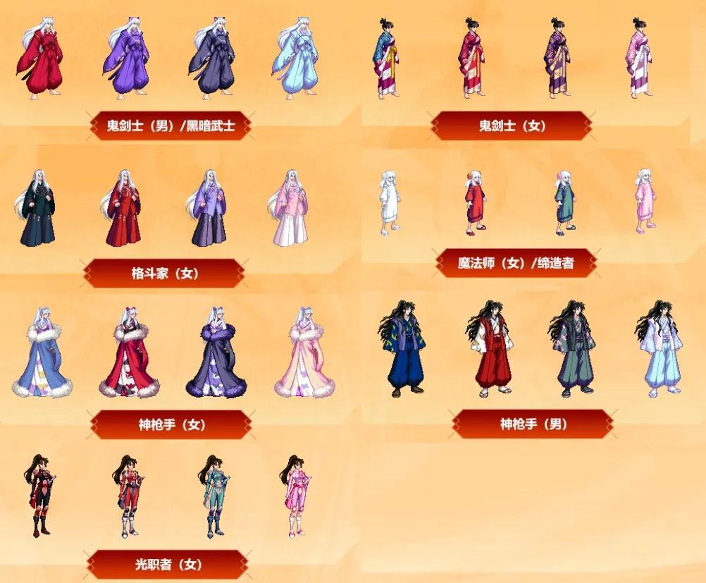 男鬼劍-犬夜叉,女鬼劍-神樂,女格鬥-應椿,女魔法-神無,女槍手-殺生丸的母親,男槍手-贏奈落,女聖職-珊瑚。