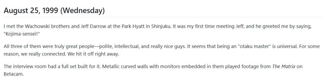 從《合金裝備2》的開發日誌中,也能感受到小島秀夫第一次與沃卓斯基姐妹(當時還是兄弟)見面時的興奮心情
