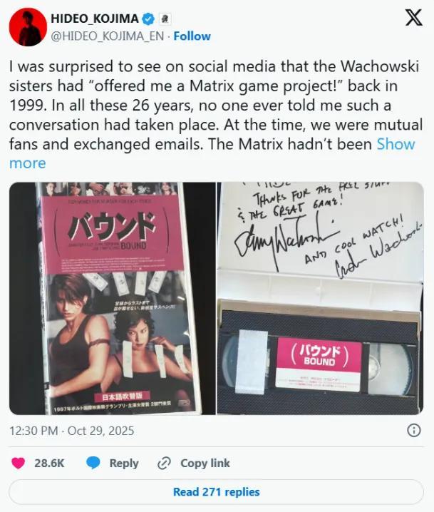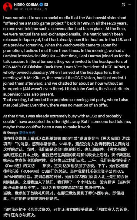 幾天前,小島秀夫在X發了一條推文,語氣頗爲驚訝,說自己在社交媒體上看到一條新聞,原來1999年的時候,沃卓斯基姐妹(當時還是兄弟)曾親自登門科樂美,邀請他開發一款《黑客帝國》遊戲,而他自己竟然對此事毫不知情。