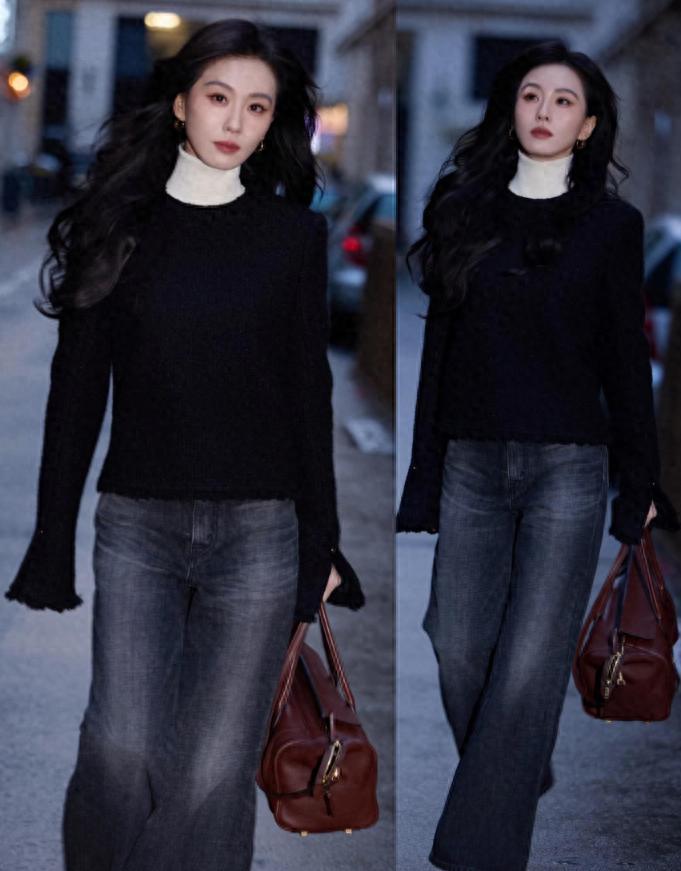 不得不說,劉詩詩真的很會穿。像這種基礎款式的黑色套頭毛衣,疊穿白色高領打底衫,簡約又迷人。憑藉一條牛仔闊腿褲,就穿出了高級氣質,慵懶的長卷發超有氛圍感。