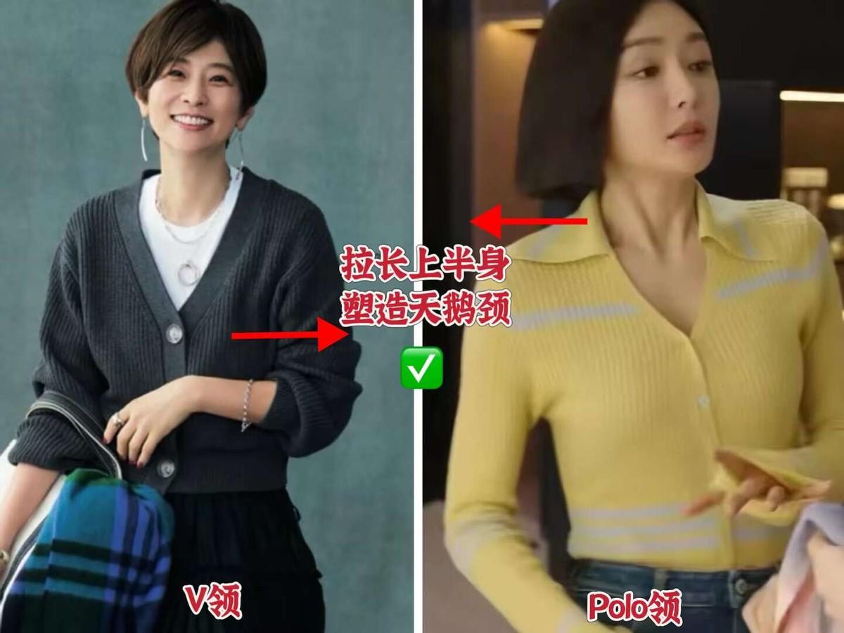 普通人在挑選奶奶衫的時候,儘量不要選領口太高的款式。優先選擇V領、polo領、低圓領,可以拉長上半身,塑造出“天鵝頸“的既視感,修飾的肩頸線條更好看。