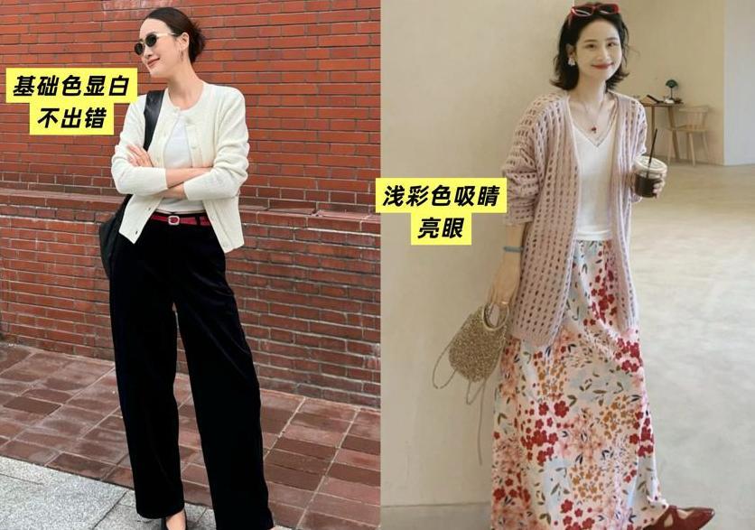 奶奶衫的色彩不能太鮮豔,也不能過於暗沉,基礎色顯白不易出錯。例如黑色、淺灰色、米白色等等,或者可以用淺彩色,提升吸睛效果,針對黃黑皮也很友好。