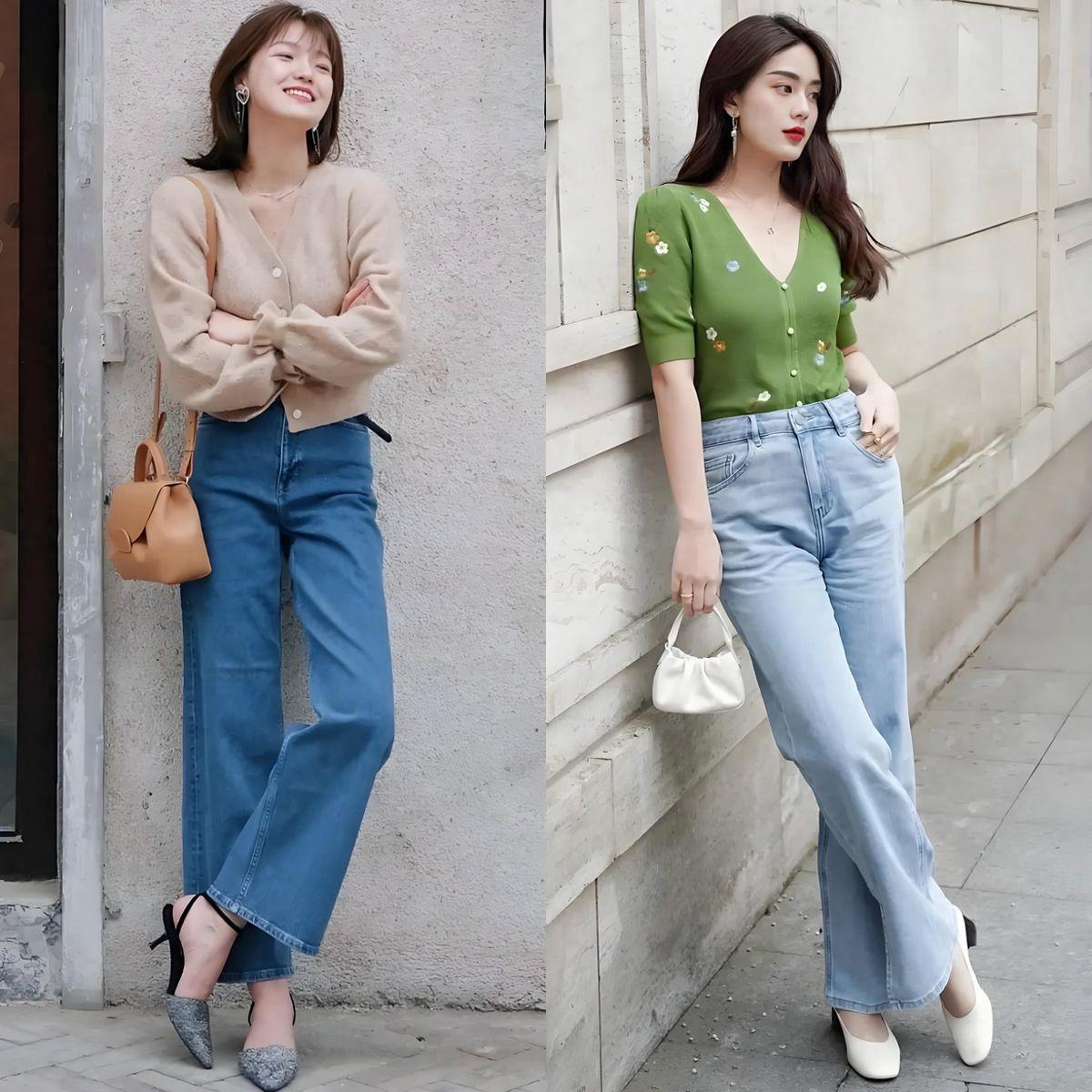 針對小個子而言,短款奶奶衫就是必選項。長度不過胯,下襬和袖口採用螺紋收緊設計,配合上V領剪裁,視覺上特別顯瘦,而且還增加了呼吸感。搭配高腰款式的牛仔喇叭褲,復古又顯身材。