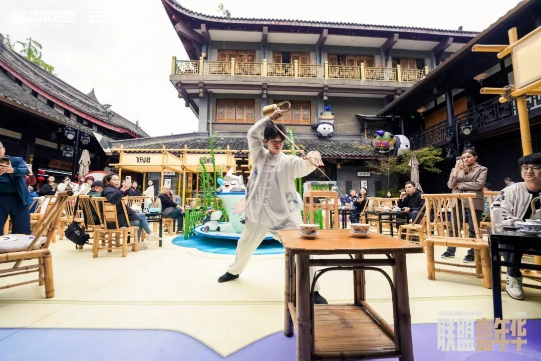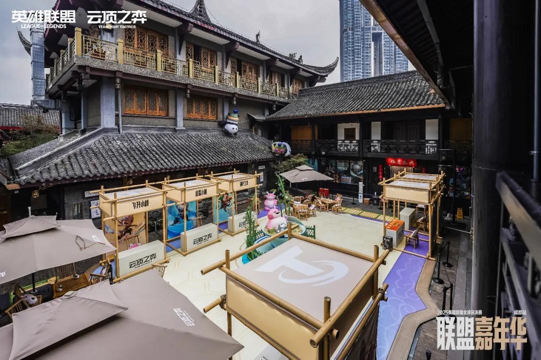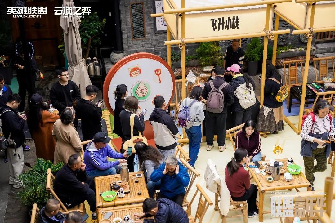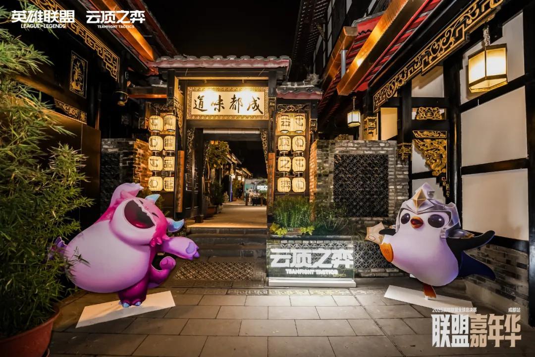 不過讓我印象最深的,除了“主舞臺”的熱鬧,還有太古裏旁邊一處看起來有些“反差”的小天地:《英雄聯盟:雲頂之弈》在春熙路上的一家老茶館裏搭建了一座“胖達巴適茶樓”——對,雲頂之弈真的做了個既能喝茶又能“下棋”的地方。