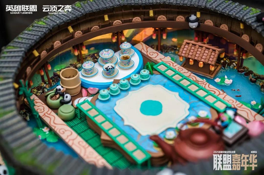 沒錯,中間的造景,就是參考這次雲頂之弈世界賽版本更新的胖達巴適茶樓棋盤元素搭建的。原本只是遊戲裏的新棋盤和熊貓、茶碗這些設計,這次都實打實地做成了現場造景。