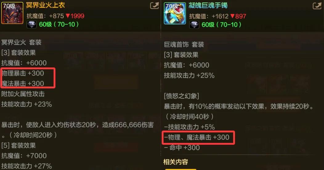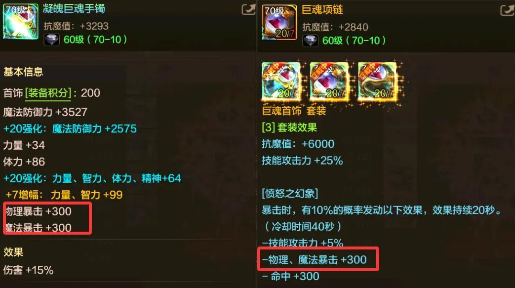 可以發現,如果單純打60級石頭人的話,實際上大部分職業不需要“巨魂套”也能達到滿暴擊,那麼這個時候就不需要強行佩戴“巨魂套”;