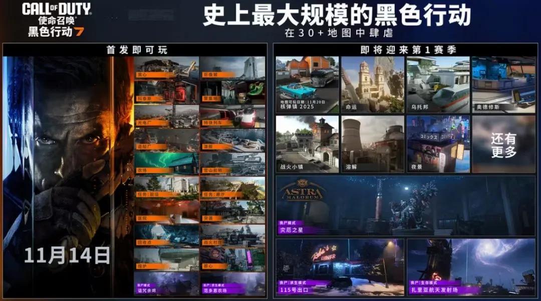 爲了讓玩家相信BO7的未來,動視目前的方案相當簡單——堆量。例如本體首發地圖數量就有18張,甚至遊戲還未正式發售,動視早早就把第一賽季的預告搬了出來,第一賽季又加7張地圖,加上大大小小各種內容,一個賽季幾乎頂了過去兩個賽季的量。