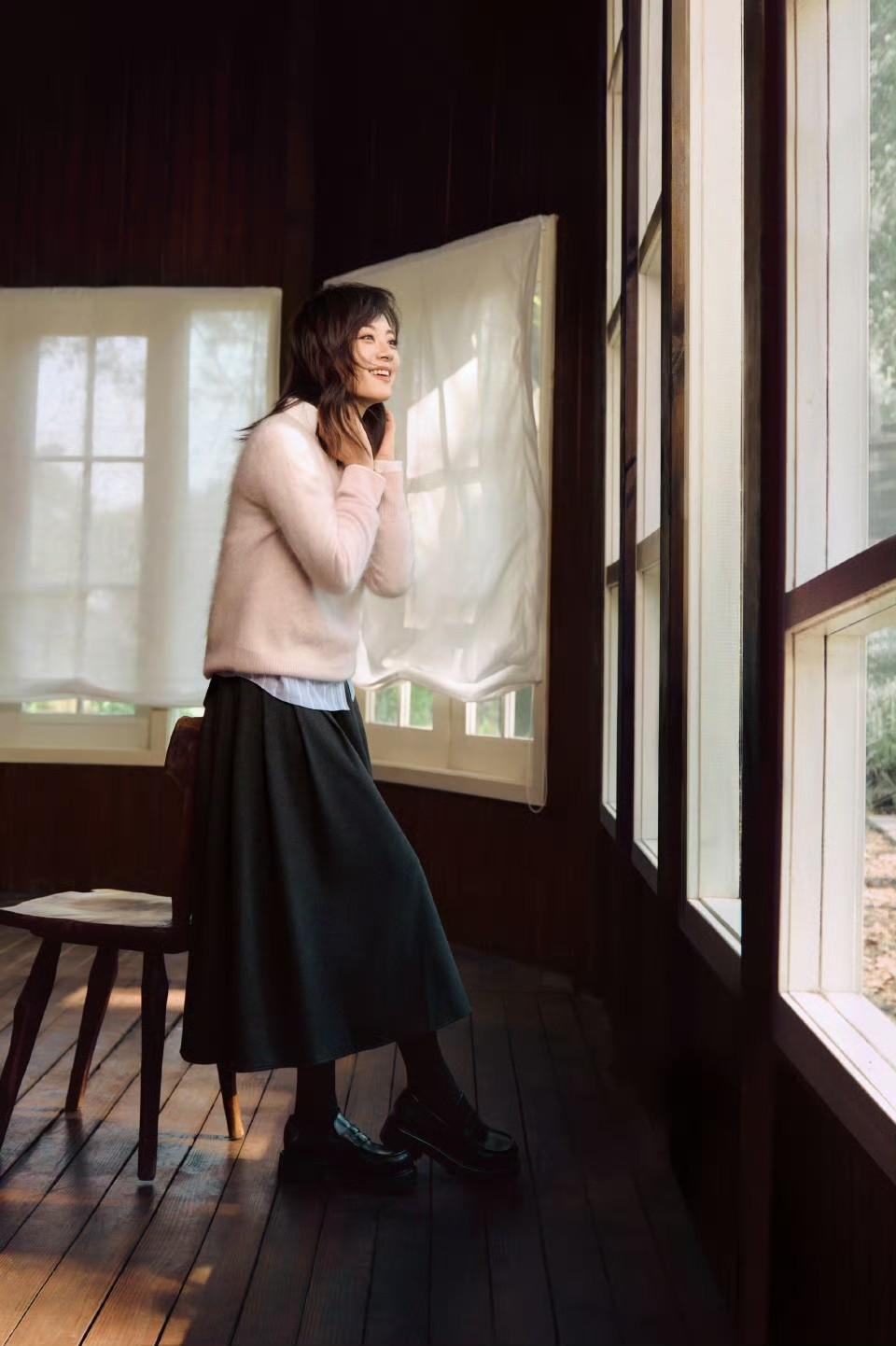 疊穿在秋冬也很常見,但前提是要避開臃腫感。像這種基礎款的粉色毛衫,疊穿淺藍色條紋襯衫,露出衣領和下襬,清爽又有層次,搭配黑色傘裙,優雅顯嫩兩不誤。