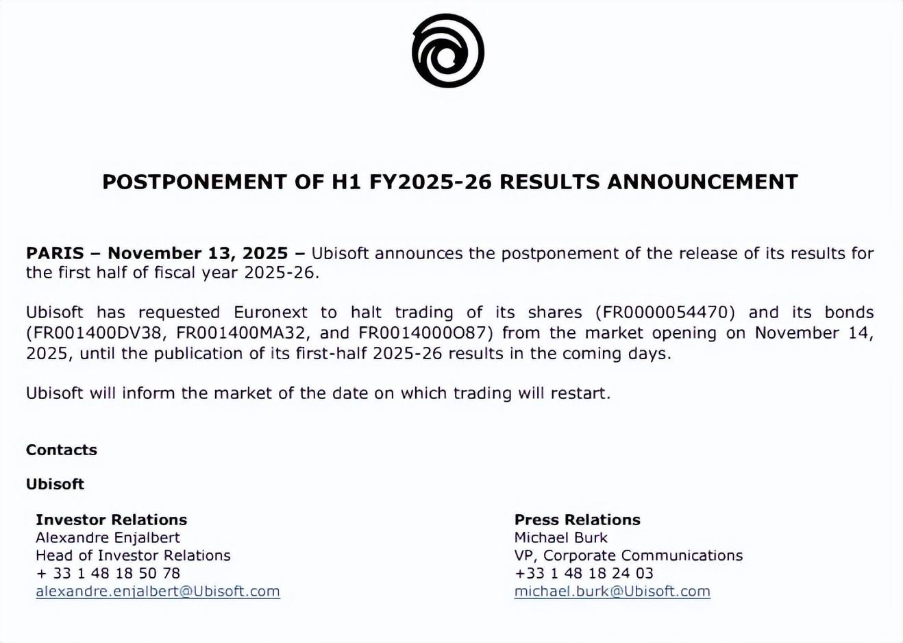 今天,原定是法國遊戲公司育碧公佈2025-2026財年上半年財報的日期,但遺憾的是計劃趕不上變化,財報信息被育碧的另一則公告代替了: