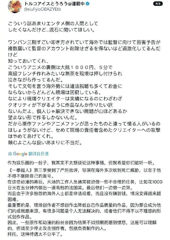 比如在這次《一拳超人》風波中,擔任過《海賊王》原畫師的Vincent Chansar就多次勸導觀衆“騷擾動畫師並不是解決問題的辦法”,他也在油管進一步提到:“有時候,問題不在於動畫工作室,而在於統籌全局的製作委員會。”
