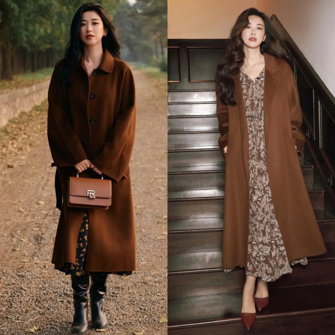 美拉德色系,只要一到秋冬,就會立馬火起來,朱珠也很愛穿!摩卡棕長大衣疊穿碎花裙,低調復古又高級。既能夠在職場步履生風,也能夠在秋冬街頭,輕鬆的做個“時髦精”。不管是配尖頭鞋、低跟靴還是樂福鞋,都很美。