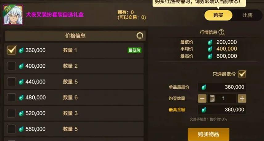 【4】拍賣行可直接入手犬夜叉時裝和鑰匙,“普通時裝”36萬一套,“抽獎鑰匙”2萬泰拉一個。