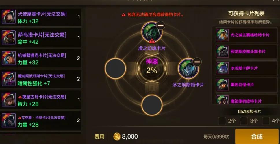 2張紫卡有2%概率合成粉卡,4張紫卡有8%概率合成粉卡,很多兄弟都會習慣性選擇4張紫卡合成,但實際上更推薦“2張紫卡”!