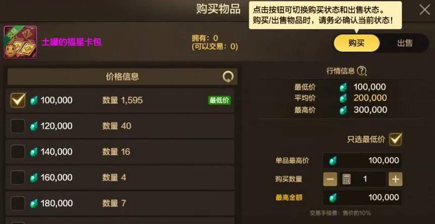 【5】封印之鎖開出來的“福星卡包”也可以交易,第一天售價10萬泰拉,過兩天就降價了,一定不要在這個時間點入手!