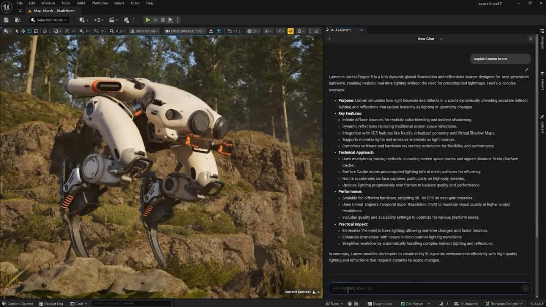 但和很多已經用上AI進行建模、編程的開發者不同,UE5.7裏對AI的使用就要謹慎得多。它只是把AI做成了一個開發者助手,一位可以隨時替你知道C++代碼、解答UE引擎疑難雜症的AI開發者。