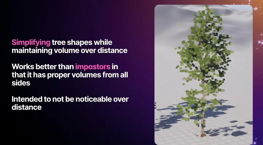 在植被渲染時,新版本的UE5引擎還引入了Nanite植被幾何渲染系統。這套系統把過去用低面數模型替代遠景模型的LOD技術,變成了相應的體素渲染技術。