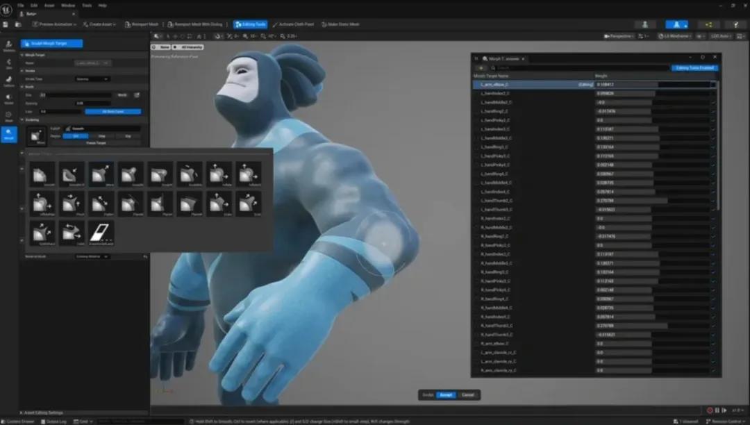 動畫流程推進到綁定模型骨骼後,新版本的UE5還引入了新的骨骼編輯器功能。模型師可以在綁定動作後的中後期工作裏,也能以雕刻工作流進行修改調整,避免了“改一發全身都要重做”的開發慘案。